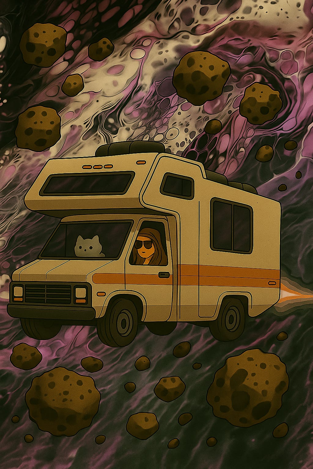 Cheryl squinted at the half-functional nav screen, which now displayed a mixture of static, a questionable rerun of Starticus: Season 12, and a blinking warning labeled "PROXIMITY: BAD." Anything but that.